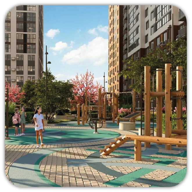• Благоустроенный двор: детская площадка, зоны отдыха и гармоничный ландшафт.